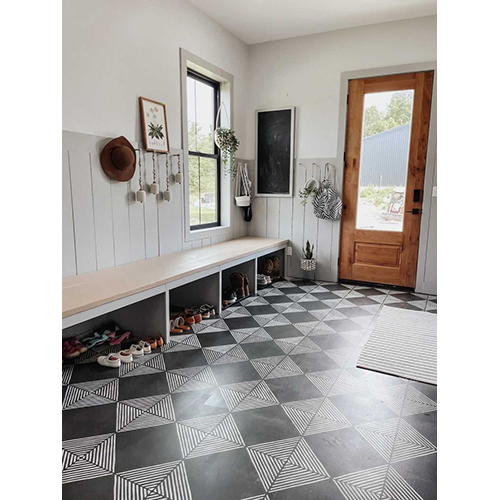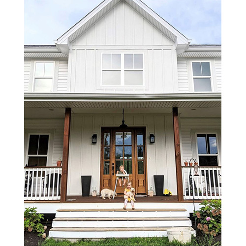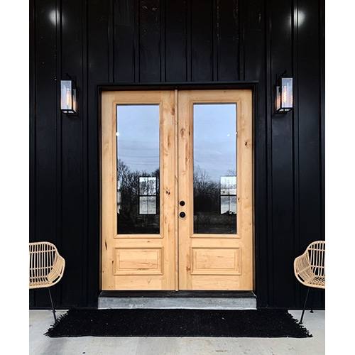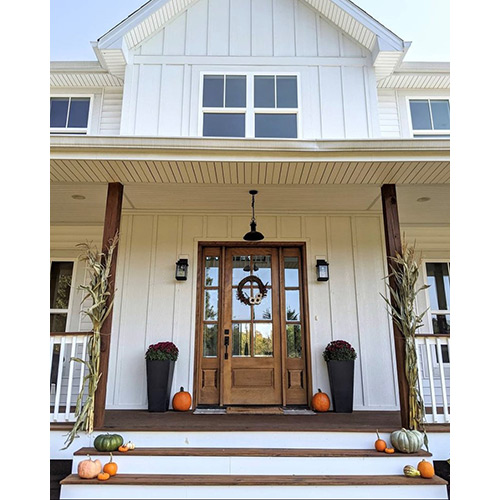 Lots of thought went into this pleasant farmhouse! Sasha explains, "I chose our Knotty Alder double doors with clear glass because when I designed our home, I wanted a clear view from the front doors all the way through the main living area with fireplace and straight to the other side of the house! We love the unrestricted views!" Sasha, like many of you, is a true DIYer. Which is one of the reasons she couldn't pass up maintaining the natural beauty of the knotty alder wood on her front door. She took on this DIY project and sealed the wood, instead of using a stain, to keep the natural wood contrast against their striking black siding. We celebrate Sasha's tenacity in caring for her family, designing their dream home and challenging herself creatively with unique DIY projects. Be sure to follow @pleasant.farmhouse for some DIY inspiration!