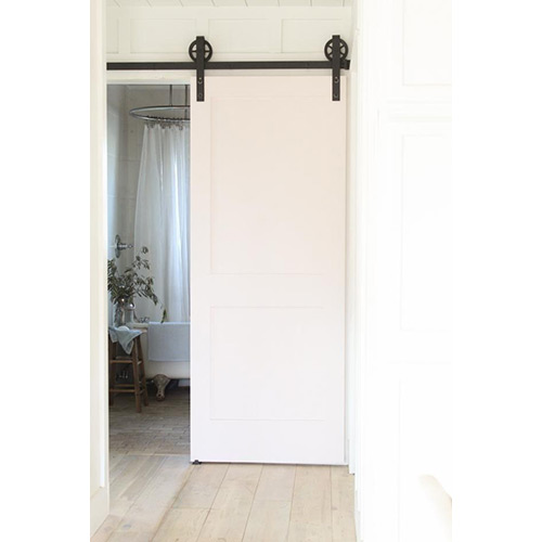 If you've been following The Vintage Bucket, you know Rendi is no stranger to DIY successes. So when they needed a space saving solution for their bathroom door, they reached out to us! Their original bathroom door was a standard swing door and it fought for space in their busy hallway. A barn door slider would be the perfect solution for this "tiny but busy area," so we set them up with a 2-panel shaker pine wood door slab! That's the beauty of DIY projects, you can customize a solution that fits your needs, while personalizing it to reflect your individual style. That's exactly what Rendi did! She relates, "since this is the first thing you see when entering from our mudroom, I wanted a statement color ... Choosing soft pink to contrast against the white makes you take a second look without being too bold where it overtakes the small space."