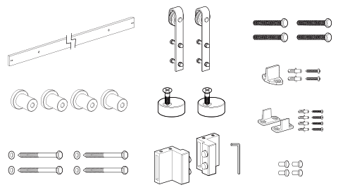 Kit Includes: 1 – 84" track, 4 spacers, 4 track mounting bolts, 2 heavy-duty hangers with bolts, 2 anti-skip disc with screws, 2 doors stops, 4 hand bolts for thinner doors, 1 hidden floor guide (for grooved doors), 2 double floor guides (for non-grooved doors), 4 track hole caps.