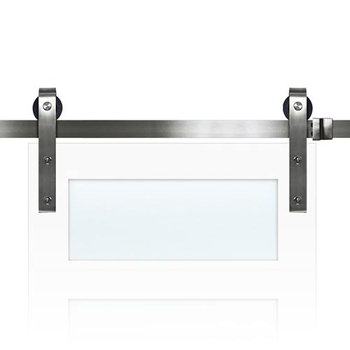 Kit Includes: 1 – 84" track, 4 spacers, 4 track mounting bolts, 2 heavy-duty hangers with bolts, 2 anti-skip disc with screws, 2 doors stops, 4 hand bolts for thinner doors, 1 hidden floor guide (for grooved doors), 2 double floor guides (for non-grooved doors), 4 track hole caps.