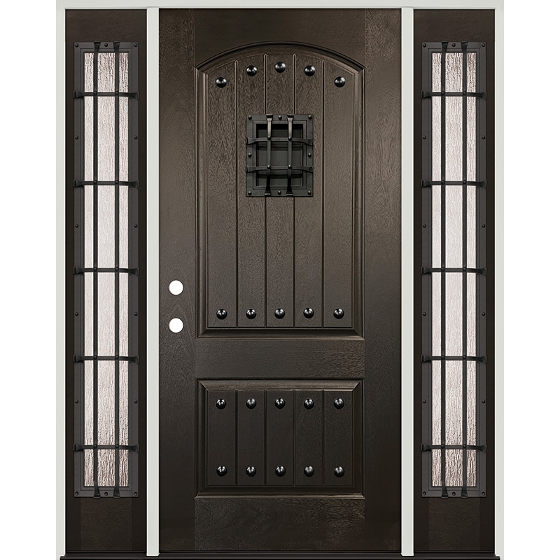 Rustic Finished Fiberglass Prehung Door Unit with Rustic Sidelites, Metal Speakeasy & Clavos